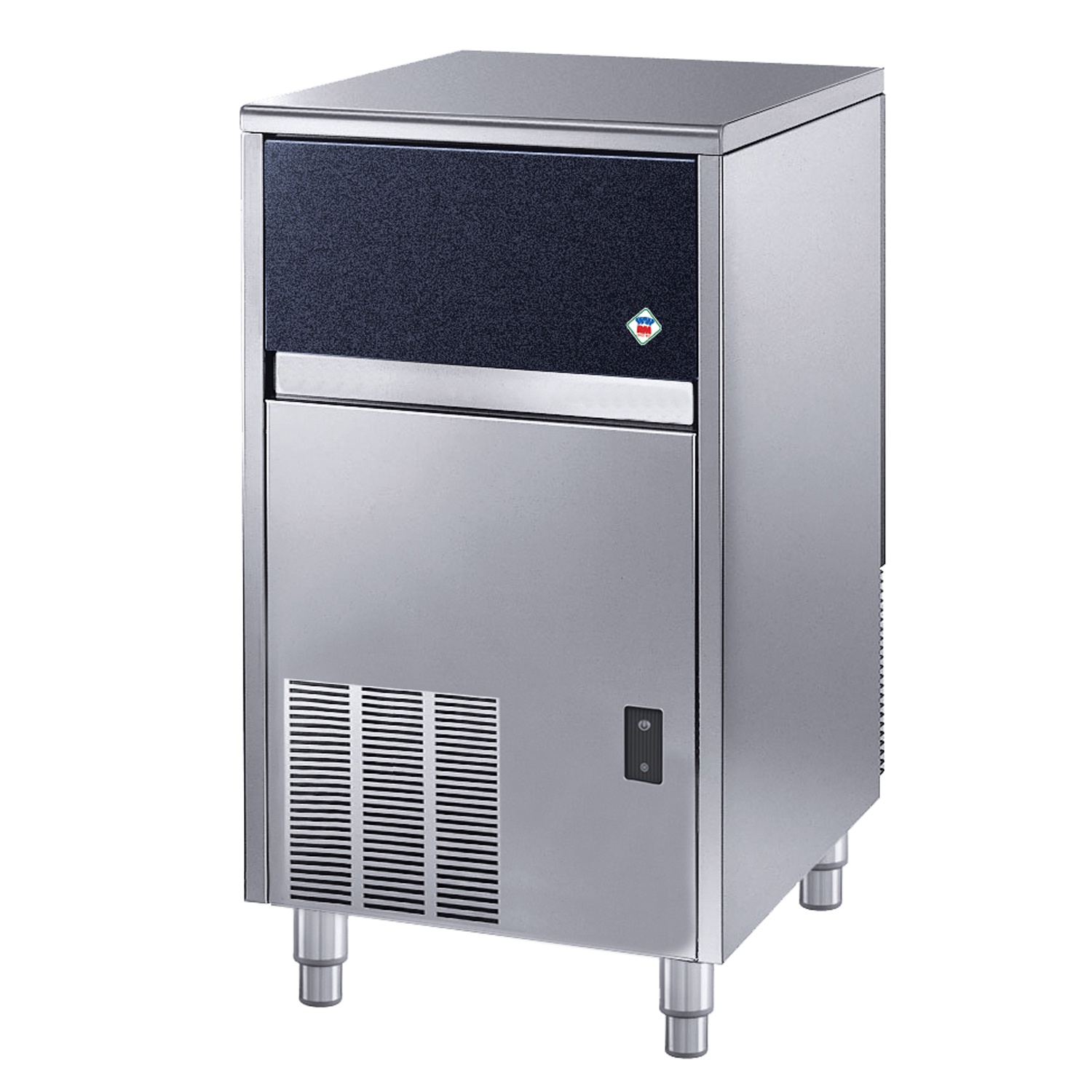 rozmer: 497x592x797mm(šxhxv); príkon elektro: 0,5kW/230V; produkcia: 48kg/deň; kapacita zásobníka: 25kg; tvar ľadu: klobúčik/18g; chladenie: voda; spotreba vody: 14 l/kg ľadu; automatický čistiaci cyklus; produkcia je uvádzaná za 24h pri teplote vody 15°C a teplote okolia 21°C; dvierka z ABS plastu